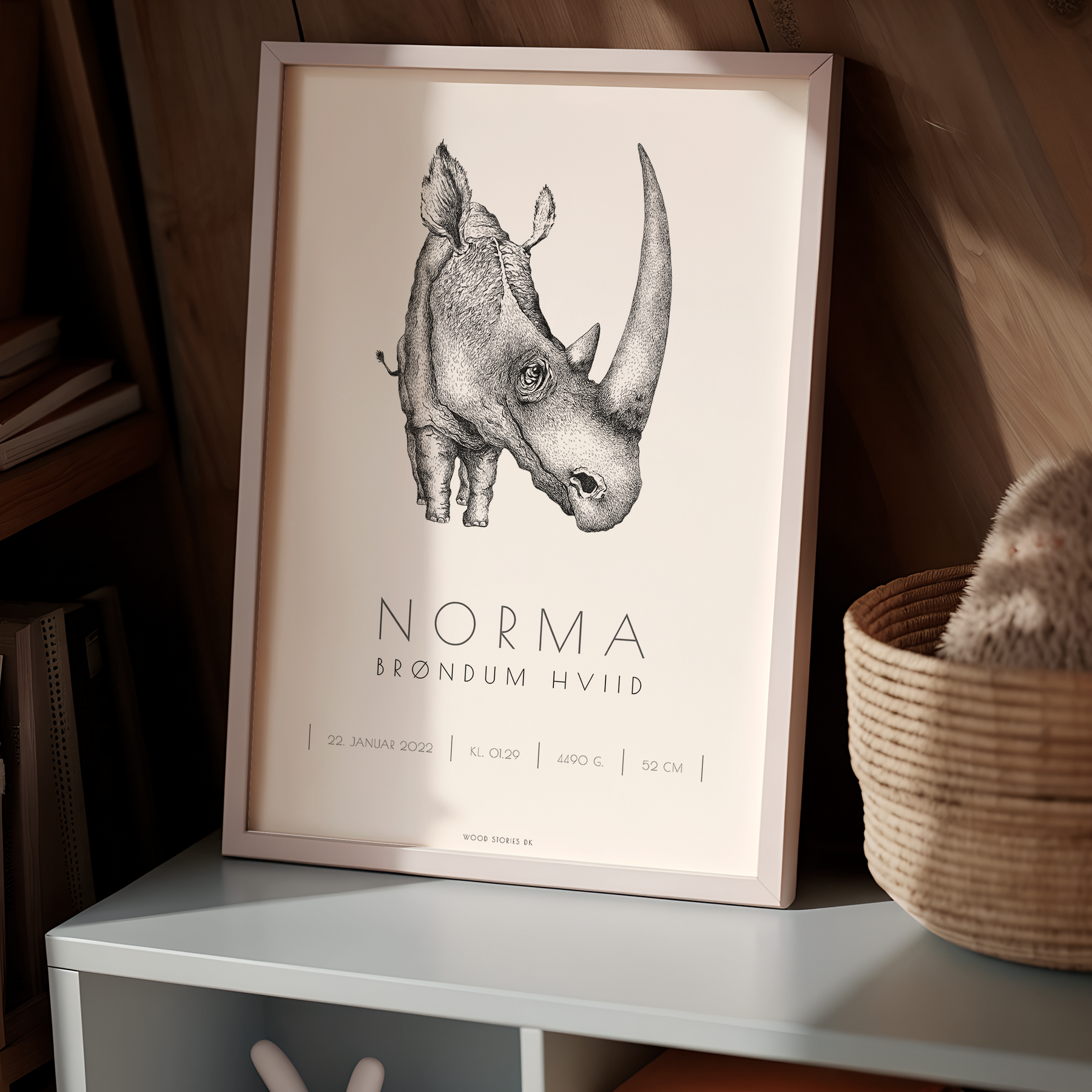 Her har I mulighed for at skrive barnets navn (inkl. efternavn, hvis I ønsker det) samt tilføje fødselsdato, tidspunkt for fødslen, vægt og længde. Den fine håndtegnede dyreillustration viser samtidig barnets forbogstav og gør det sjovt for barnet at lære både dyr og bogstaver at kende.