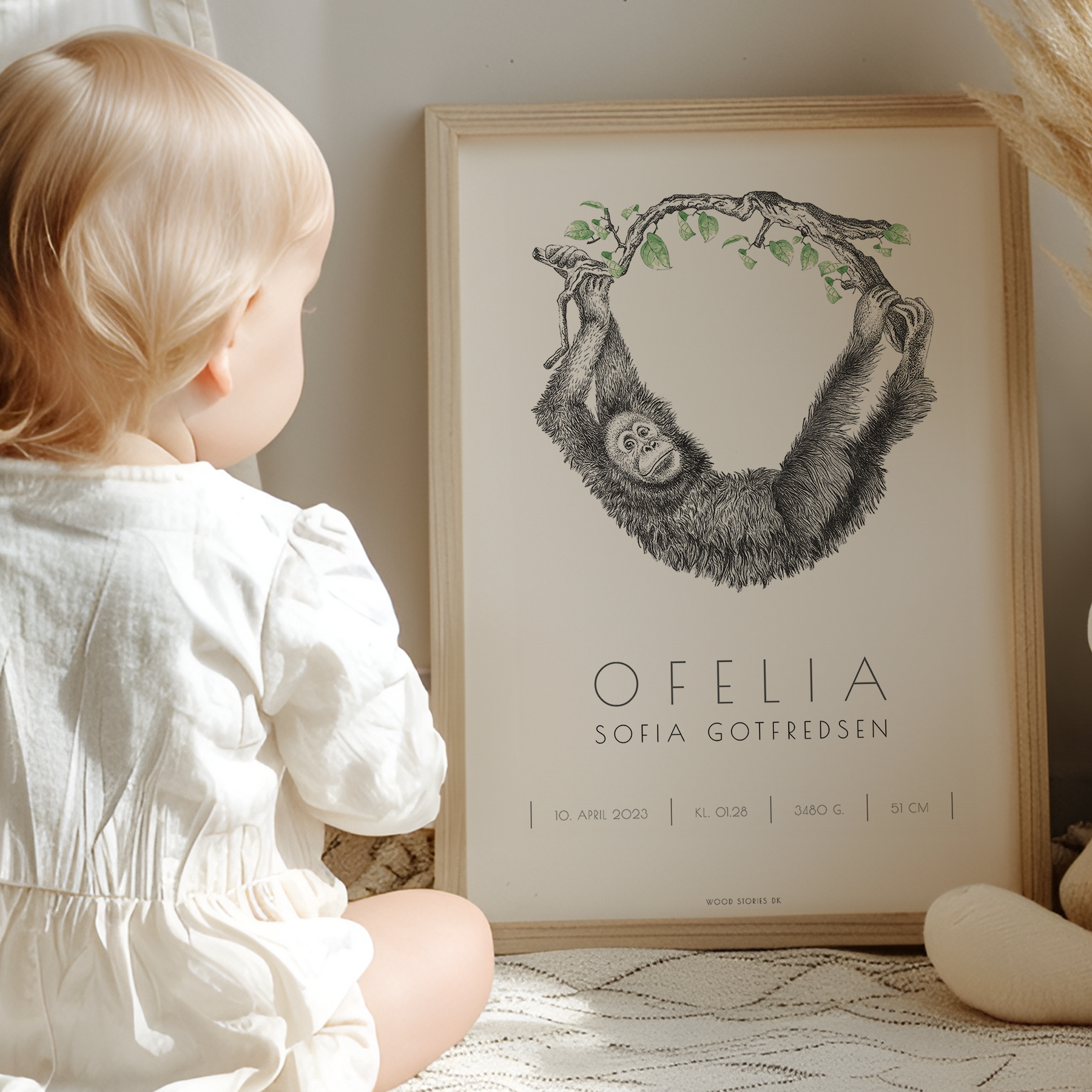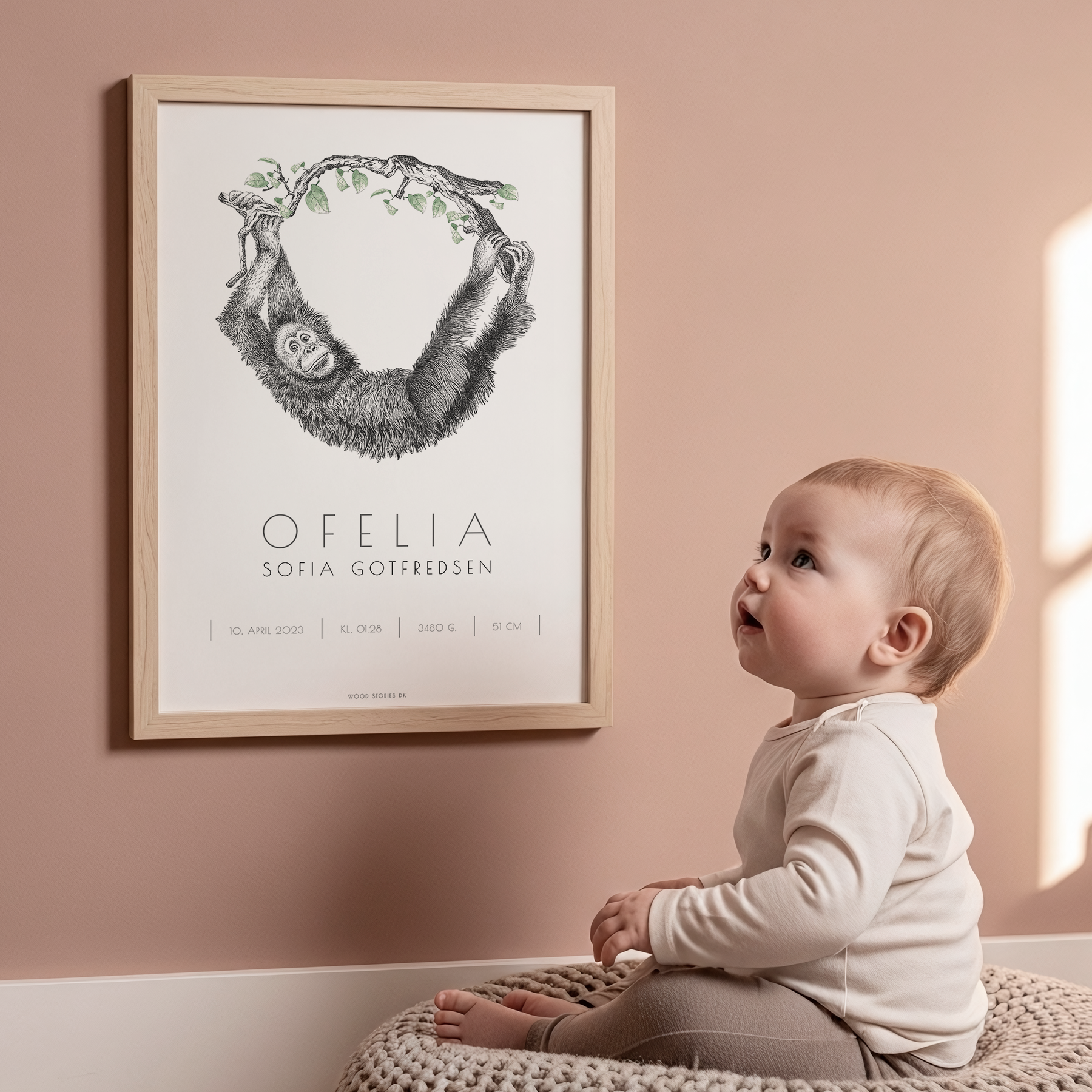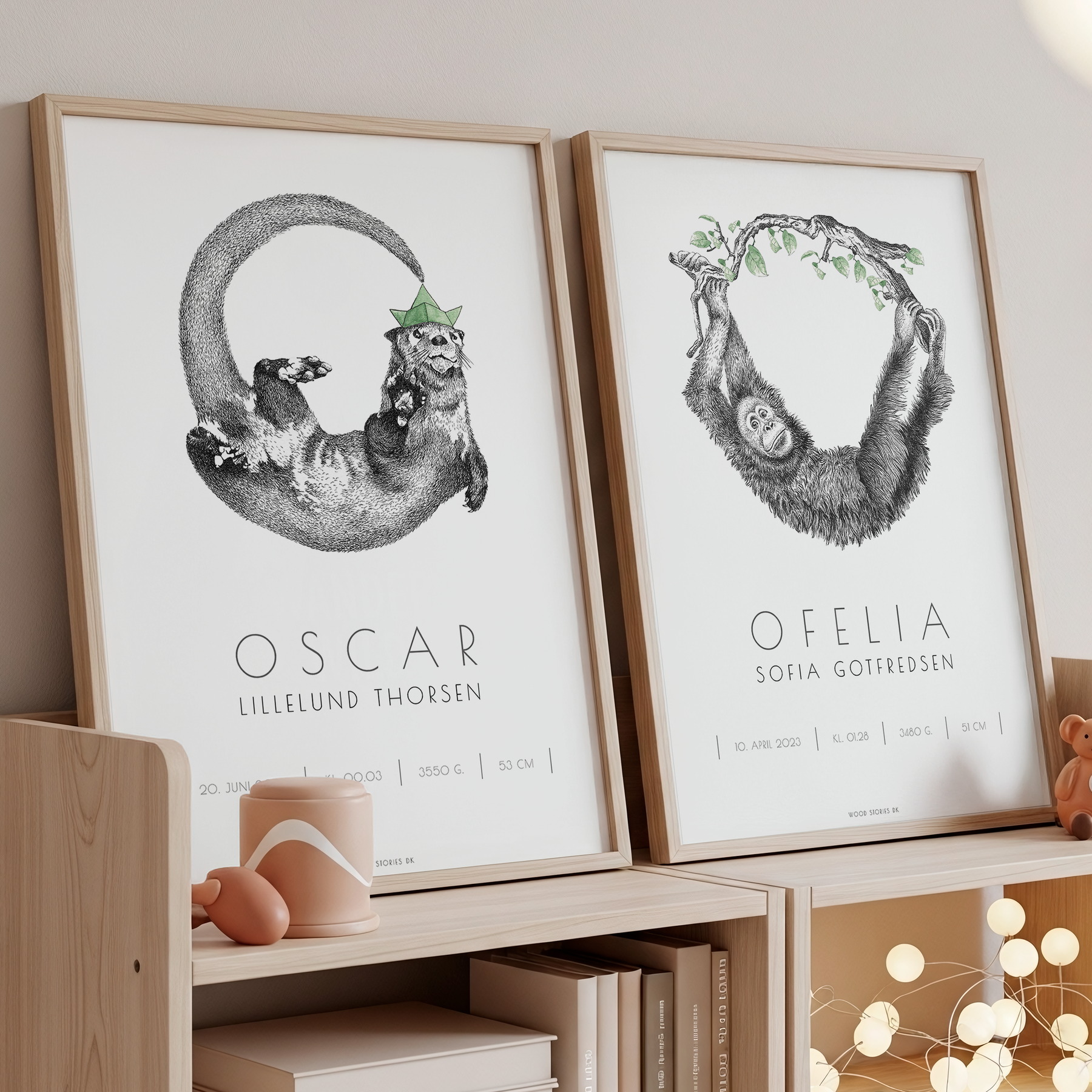 Her har I mulighed for at skrive barnets navn (inkl. efternavn, hvis I ønsker det) samt tilføje fødselsdato, tidspunkt for fødslen, vægt og længde. Den fine håndtegnede dyreillustration viser samtidig barnets forbogstav og gør det sjovt for barnet at lære både dyr og bogstaver at kende.