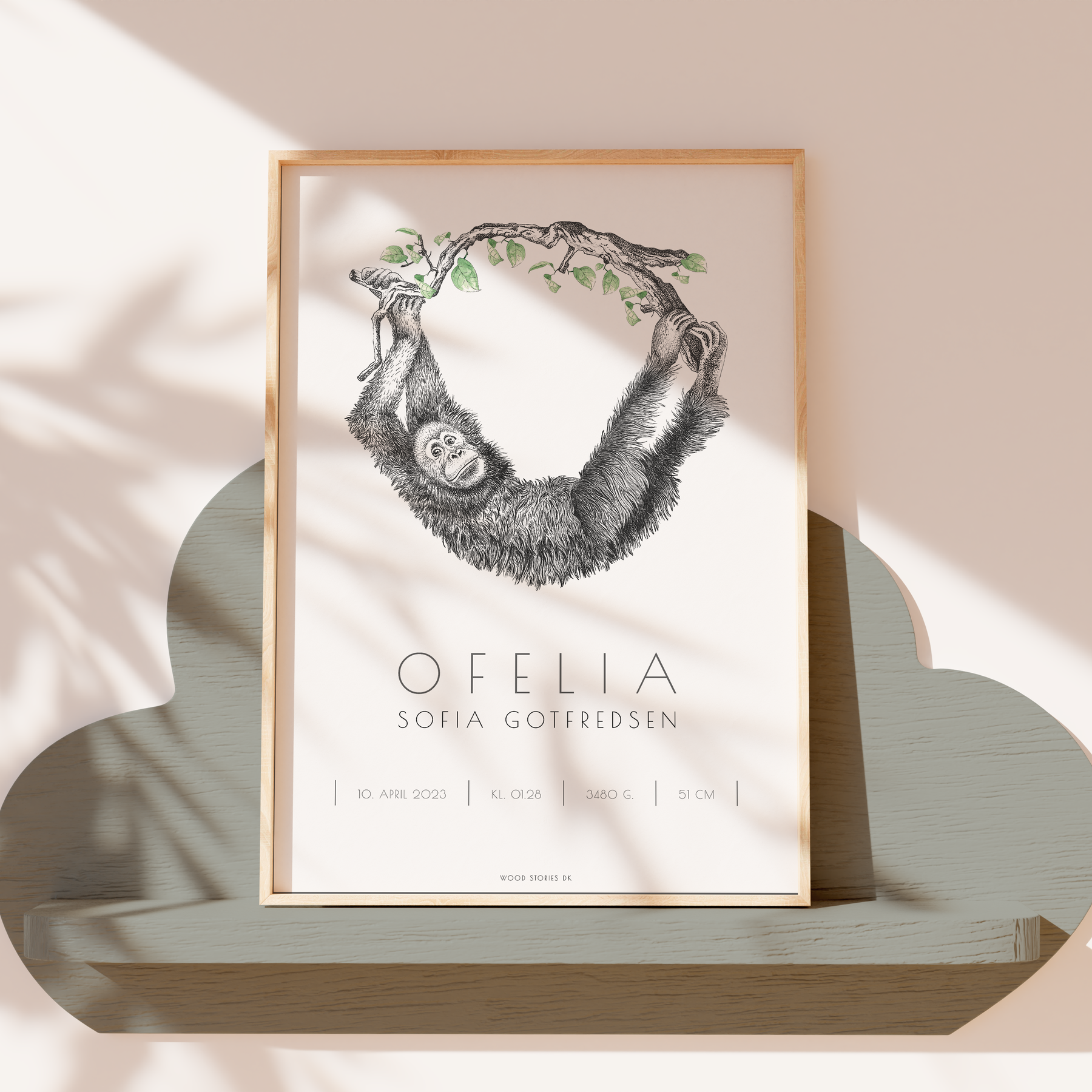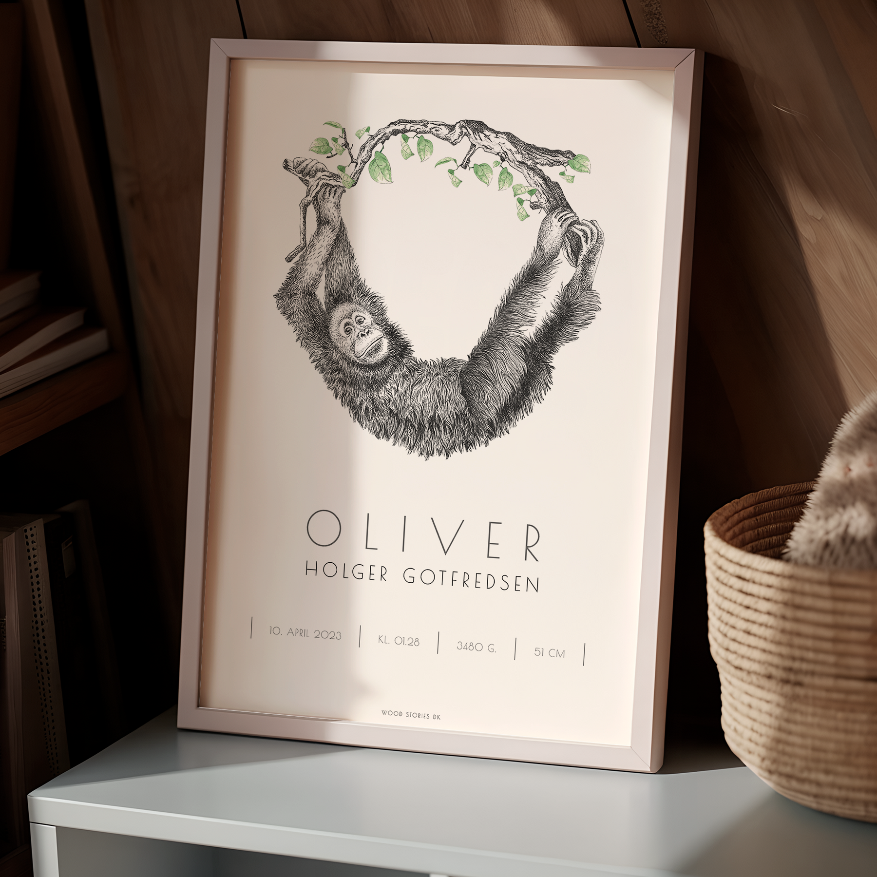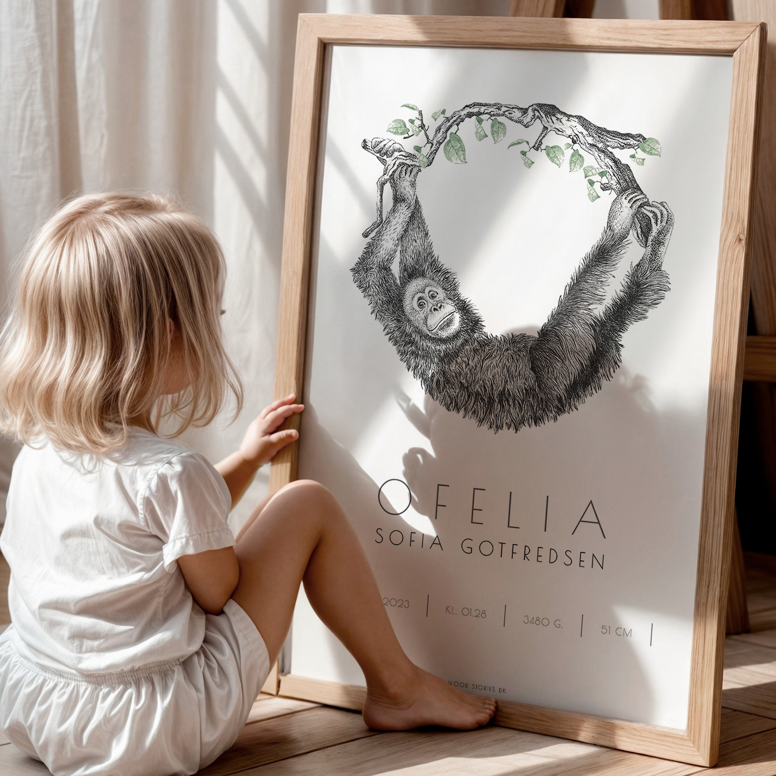 Her har I mulighed for at skrive barnets navn (inkl. efternavn, hvis I ønsker det) samt tilføje fødselsdato, tidspunkt for fødslen, vægt og længde. Den fine håndtegnede dyreillustration viser samtidig barnets forbogstav og gør det sjovt for barnet at lære både dyr og bogstaver at kende.