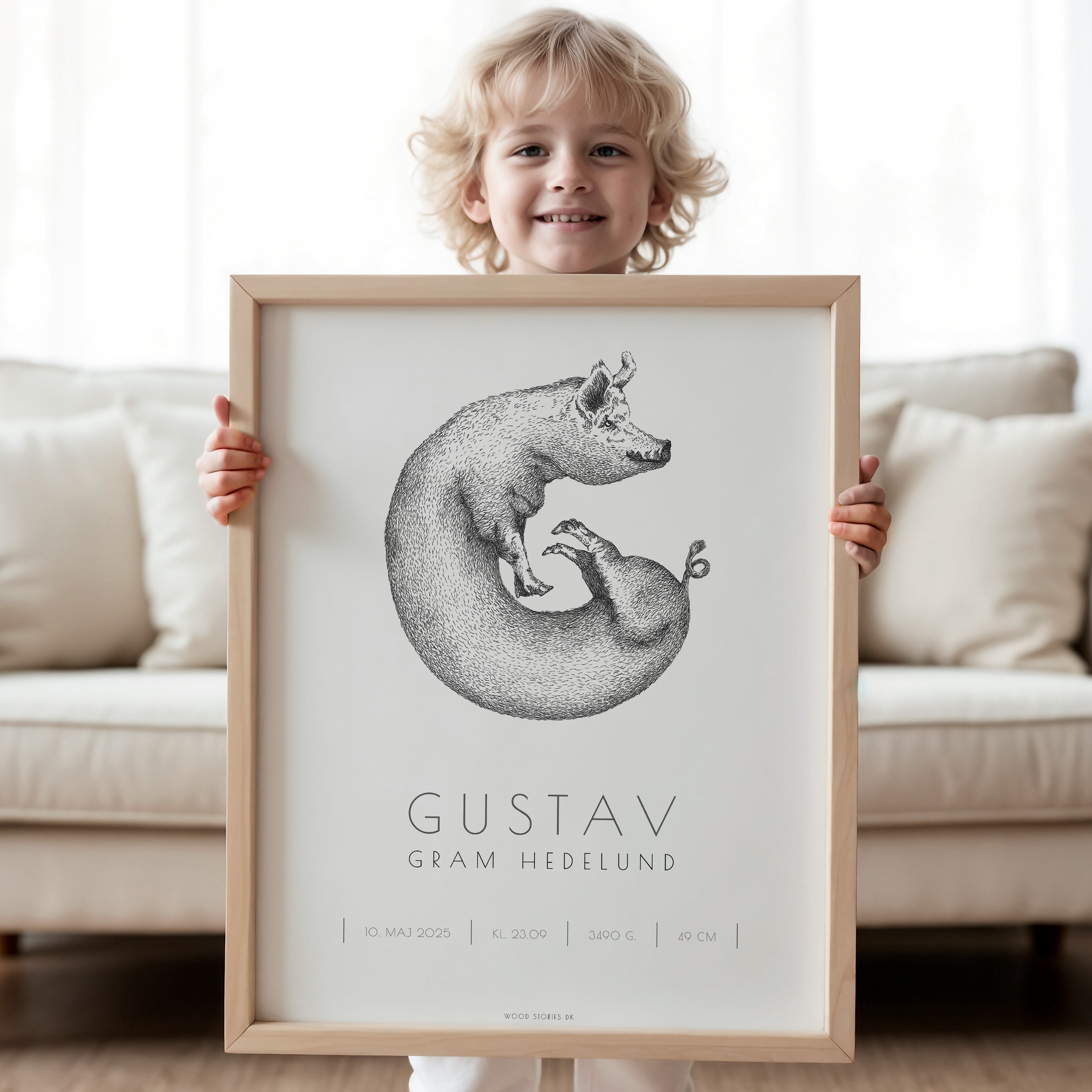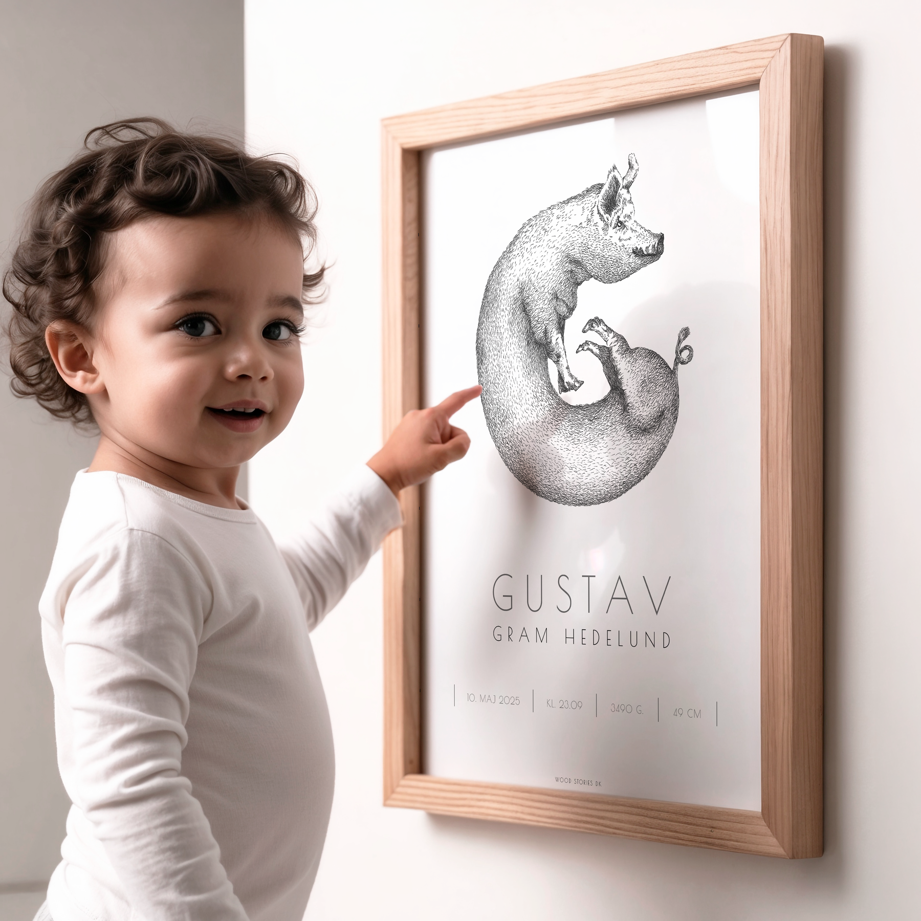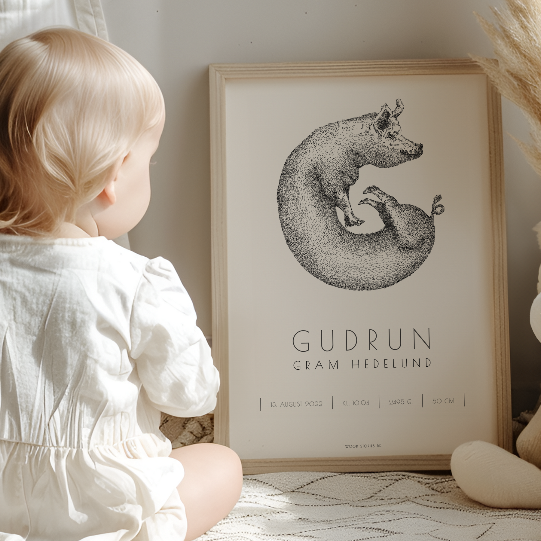 Her har I mulighed for at skrive barnets navn (inkl. efternavn, hvis I ønsker det) samt tilføje fødselsdato, tidspunkt for fødslen, vægt og længde. Den fine håndtegnede dyreillustration viser samtidig barnets forbogstav og gør det sjovt for barnet at lære både dyr og bogstaver at kende.