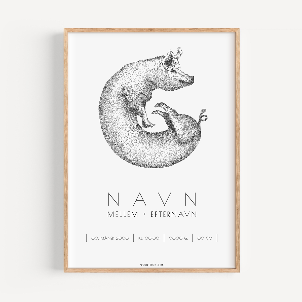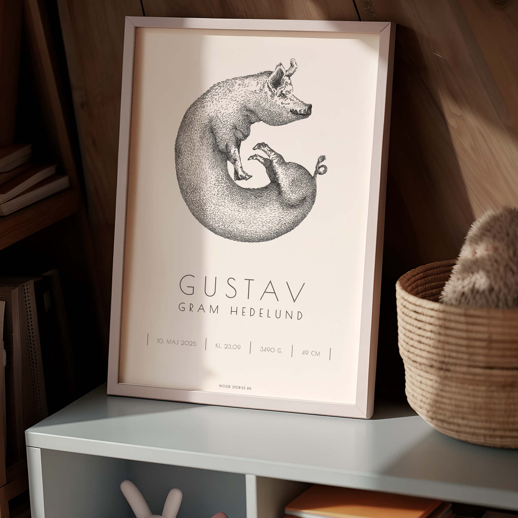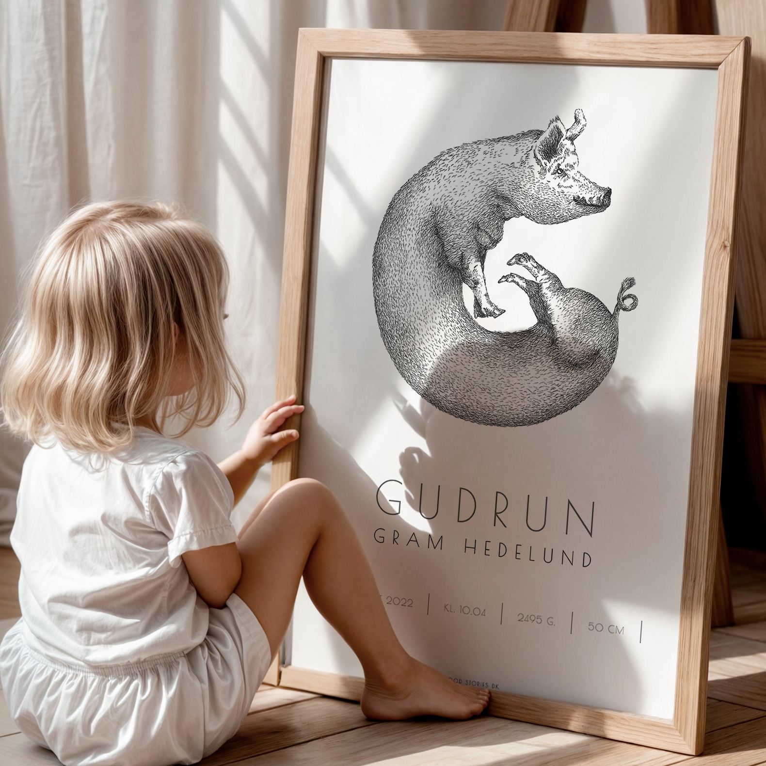 Her har I mulighed for at skrive barnets navn (inkl. efternavn, hvis I ønsker det) samt tilføje fødselsdato, tidspunkt for fødslen, vægt og længde. Den fine håndtegnede dyreillustration viser samtidig barnets forbogstav og gør det sjovt for barnet at lære både dyr og bogstaver at kende.