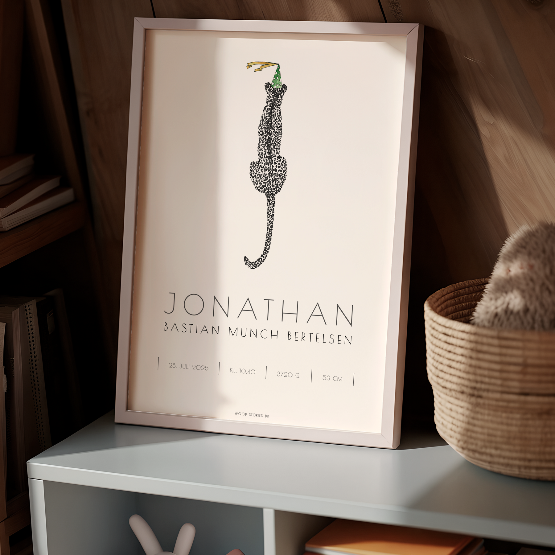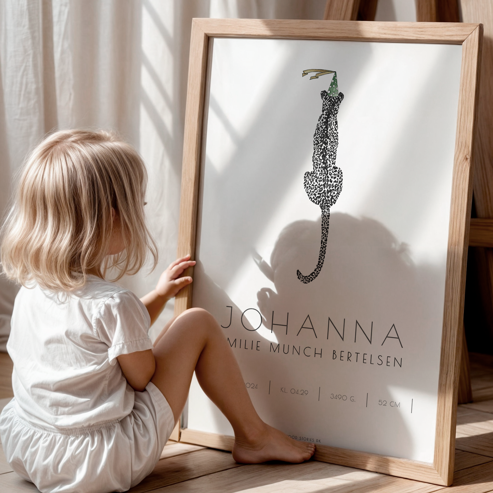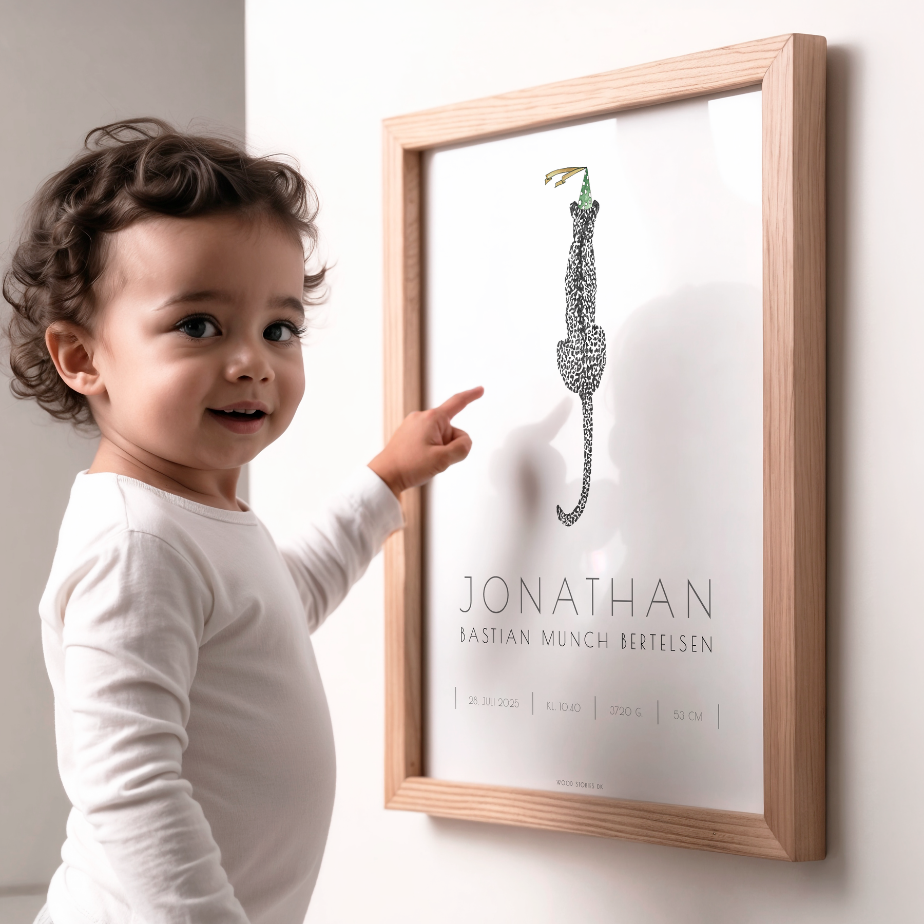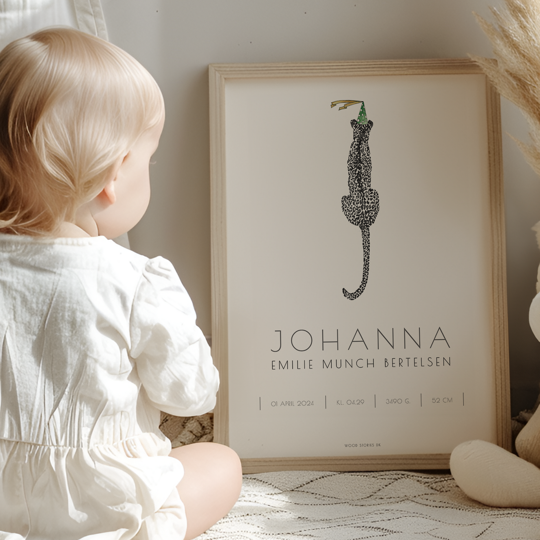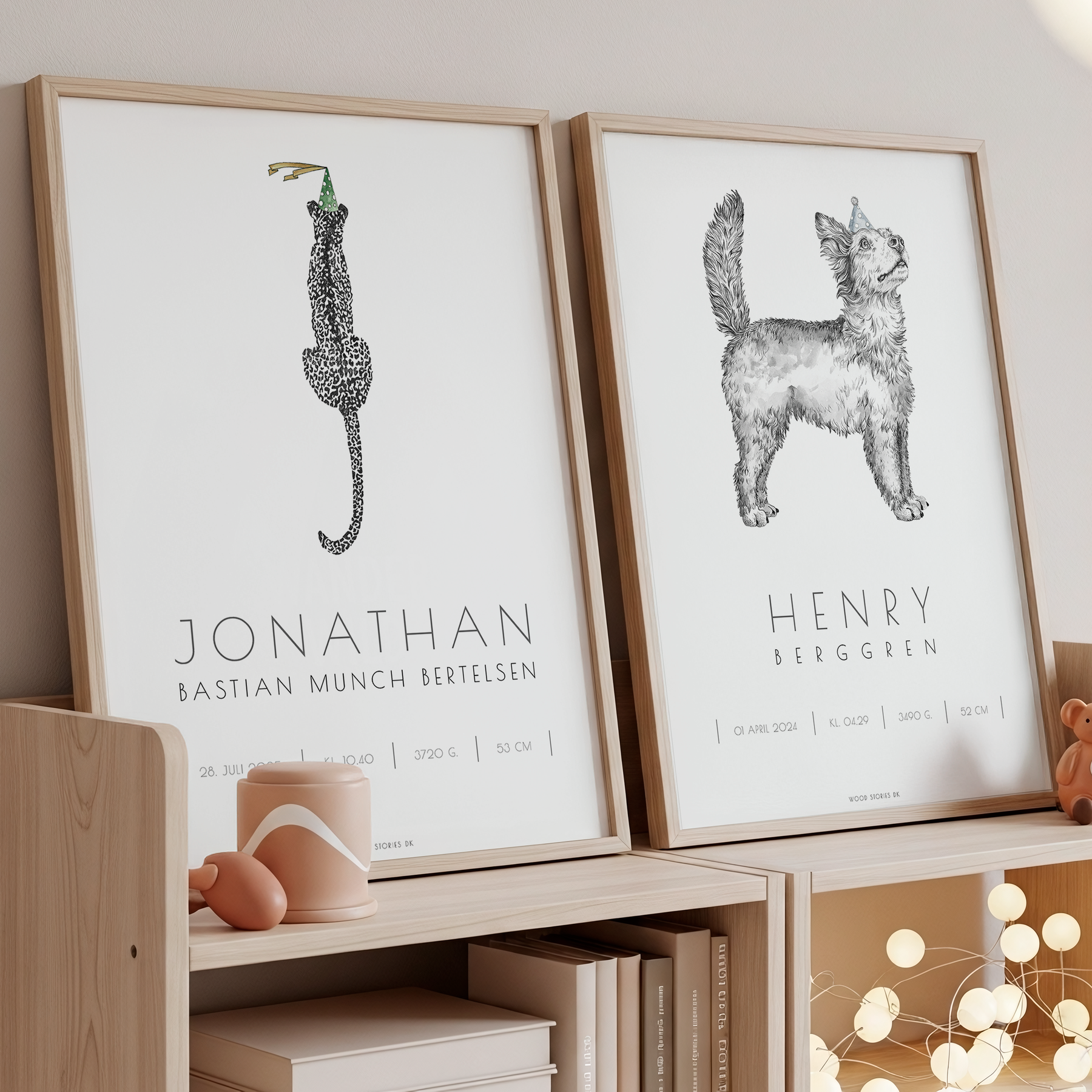 Her har I mulighed for at skrive barnets navn (inkl. efternavn, hvis I ønsker det) samt tilføje fødselsdato, tidspunkt for fødslen, vægt og længde. Den fine håndtegnede dyreillustration viser samtidig barnets forbogstav og gør det sjovt for barnet at lære både dyr og bogstaver at kende.