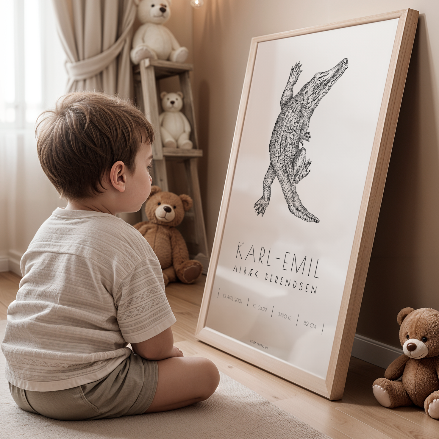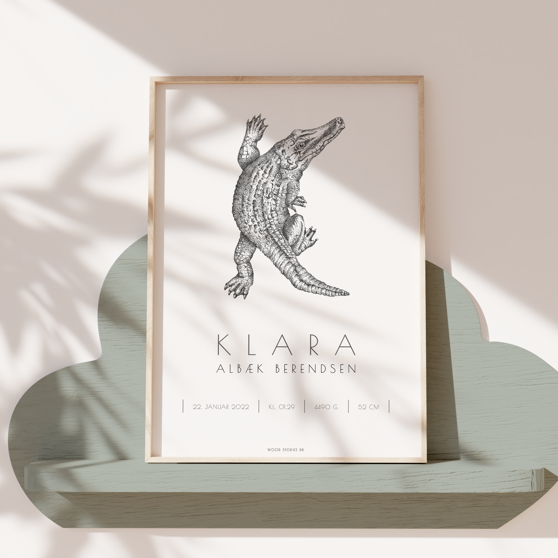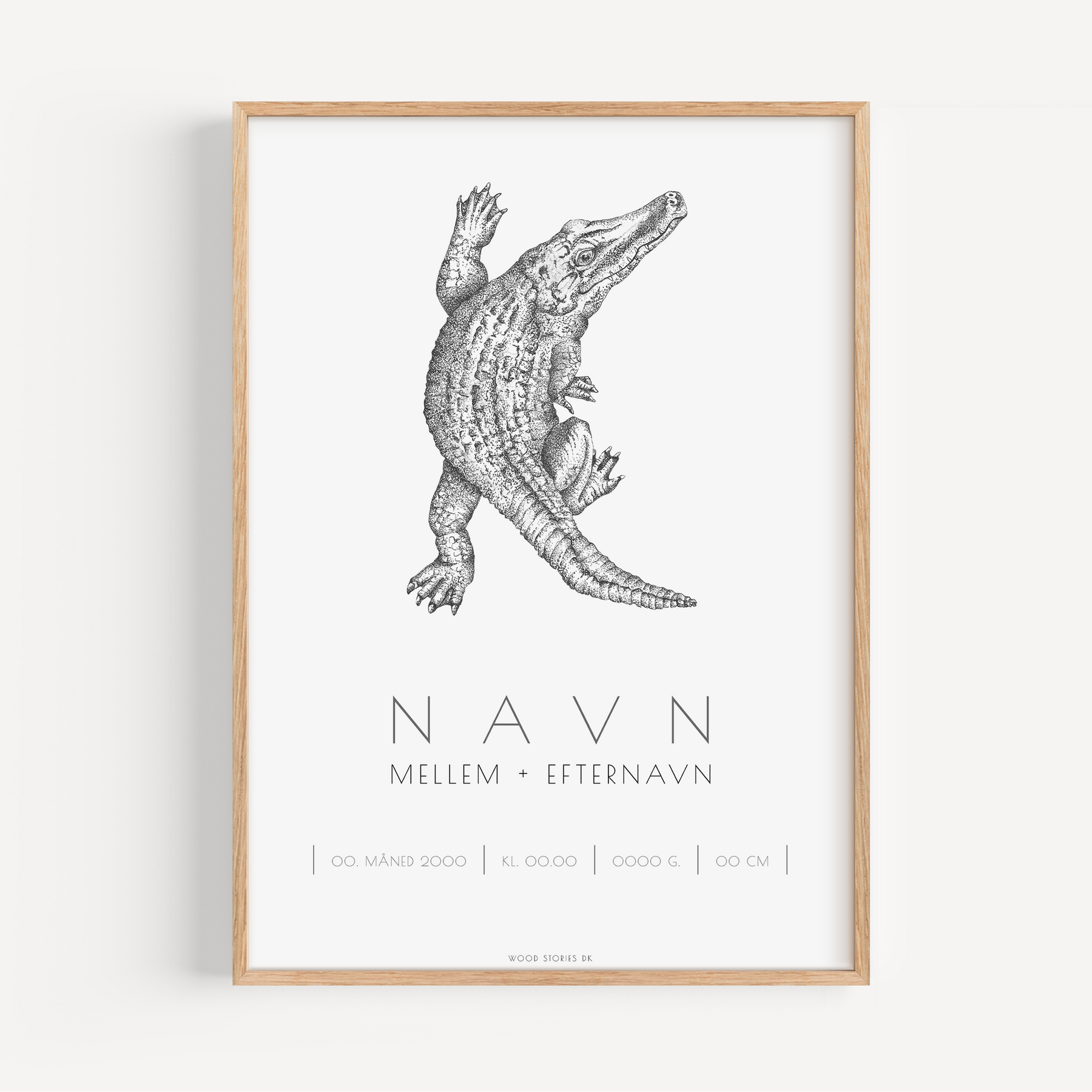 Her har I mulighed for at skrive barnets navn (inkl. efternavn, hvis I ønsker det) samt tilføje fødselsdato, tidspunkt for fødslen, vægt og længde. Den fine håndtegnede dyreillustration viser samtidig barnets forbogstav og gør det sjovt for barnet at lære både dyr og bogstaver at kende.