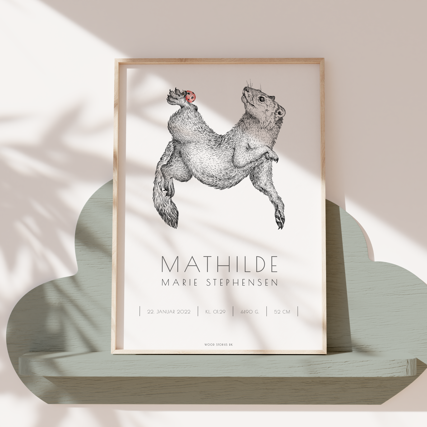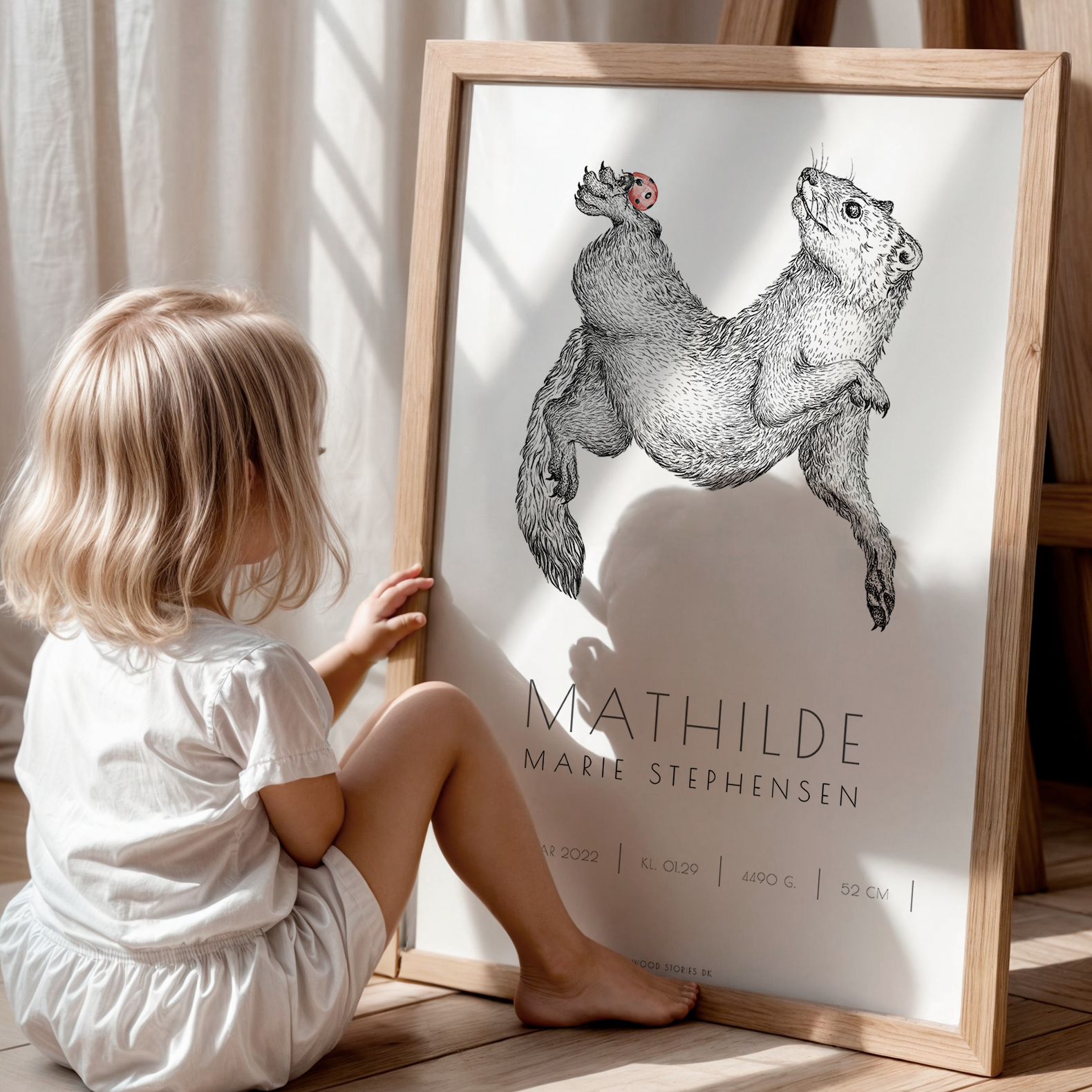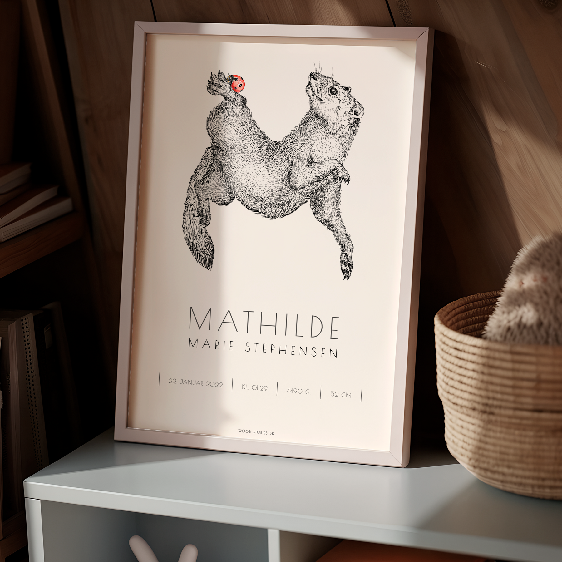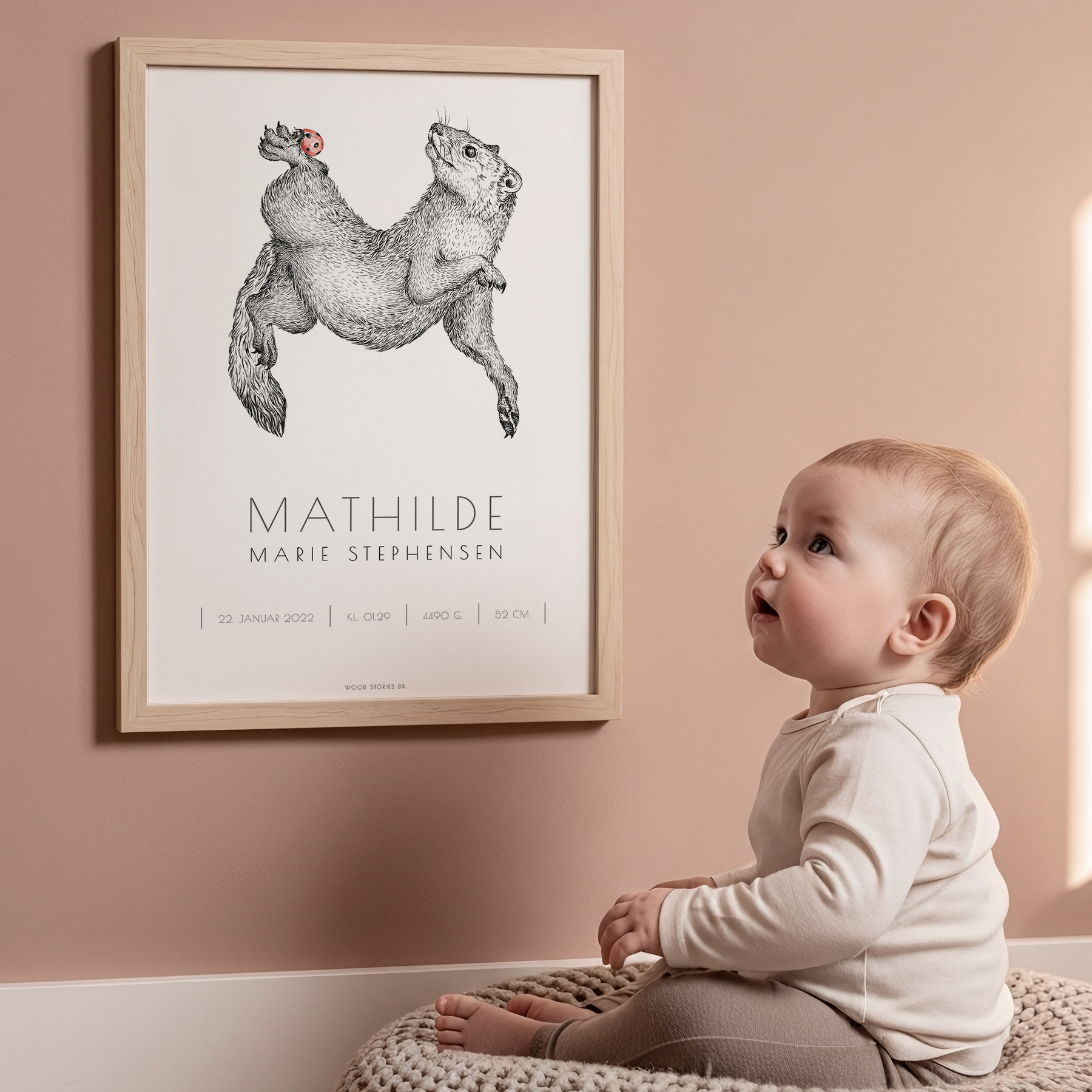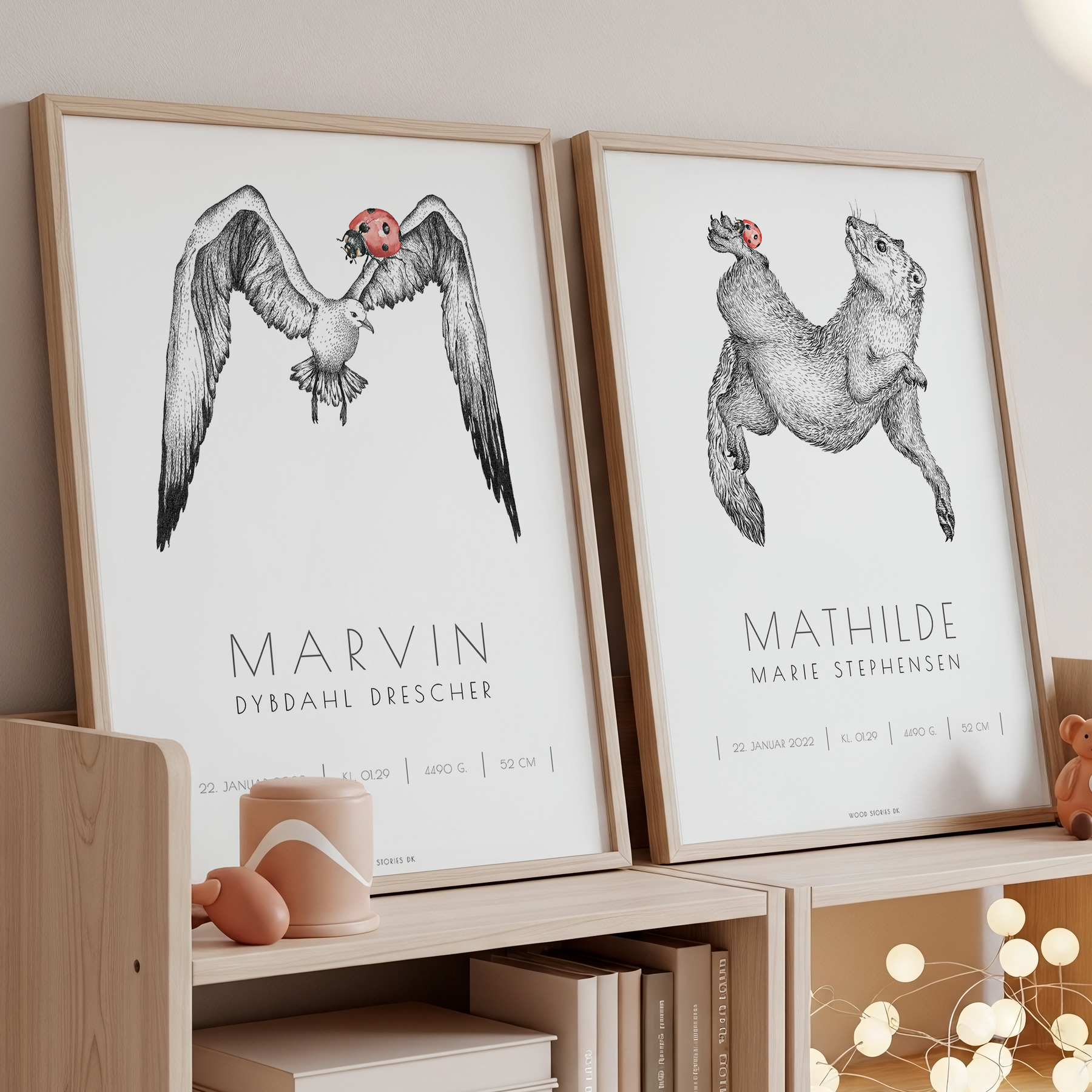 Her har I mulighed for at skrive barnets navn (inkl. efternavn, hvis I ønsker det) samt tilføje fødselsdato, tidspunkt for fødslen, vægt og længde. Den fine håndtegnede dyreillustration viser samtidig barnets forbogstav og gør det sjovt for barnet at lære både dyr og bogstaver at kende.