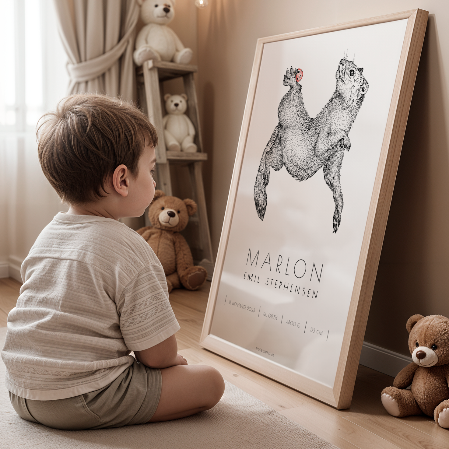 Forevig dit barns fødselsdata med en unik håndtegnet fødselsplakat. Den personlige fødselsplakat er også en oplagt dåbs- eller barselsgave og vil med sikkerhed skabe stor glæde hos modtageren.