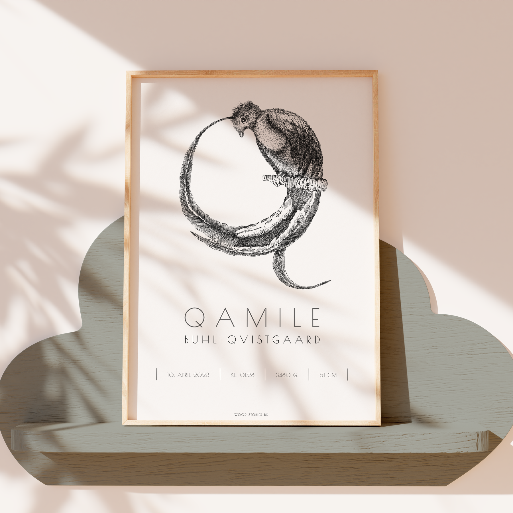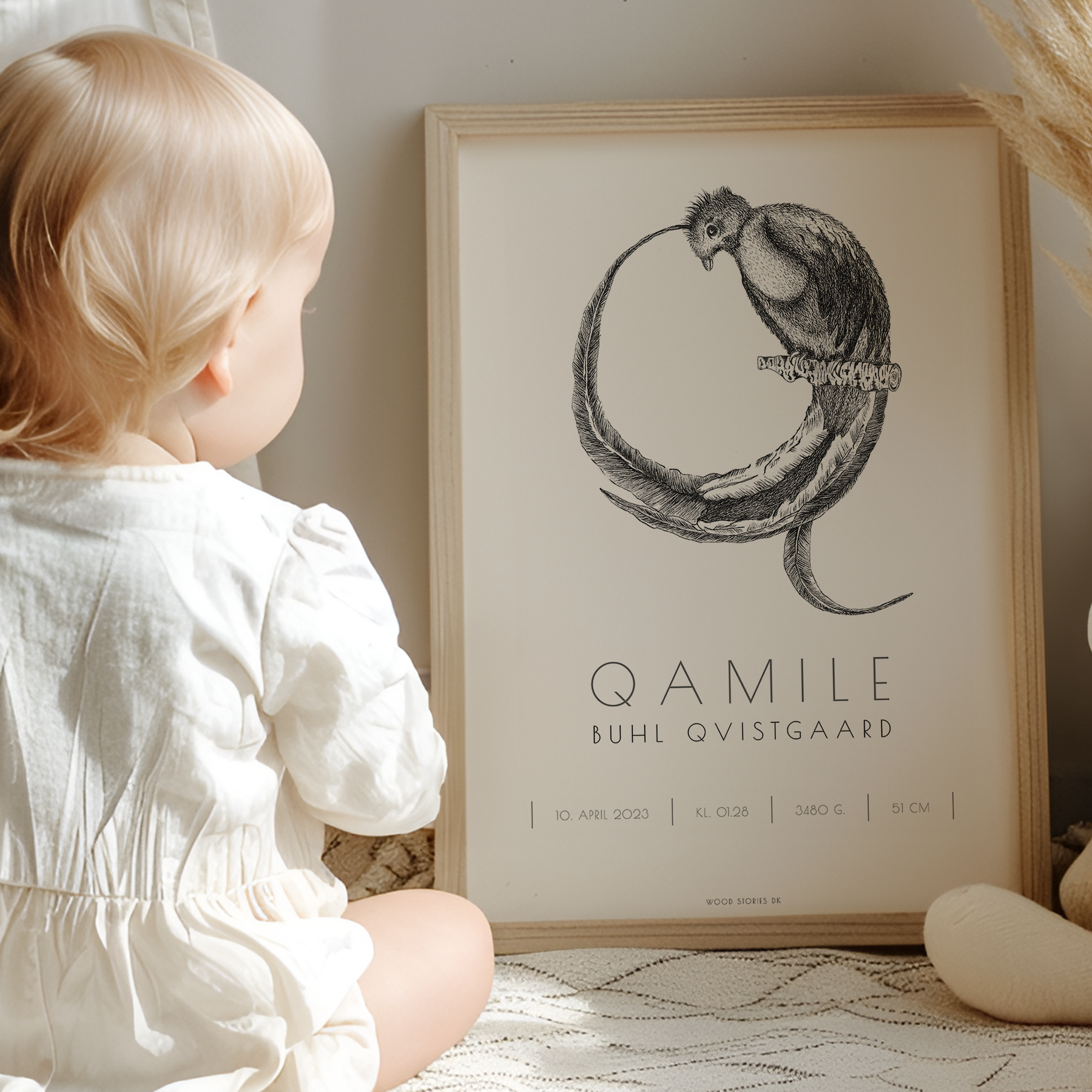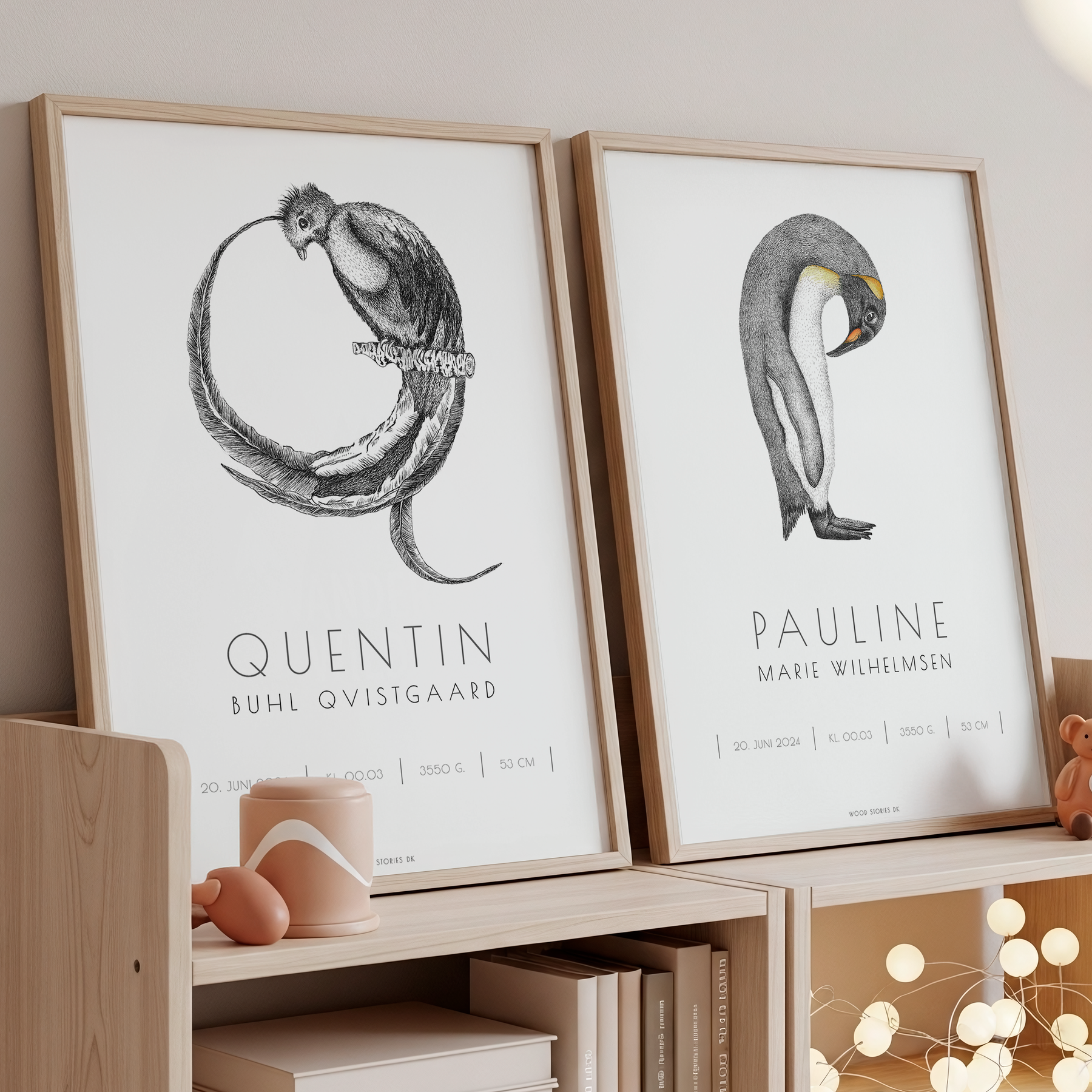 Her har I mulighed for at skrive barnets navn (inkl. efternavn, hvis I ønsker det) samt tilføje fødselsdato, tidspunkt for fødslen, vægt og længde. Den fine håndtegnede dyreillustration viser samtidig barnets forbogstav og gør det sjovt for barnet at lære både dyr og bogstaver at kende.
