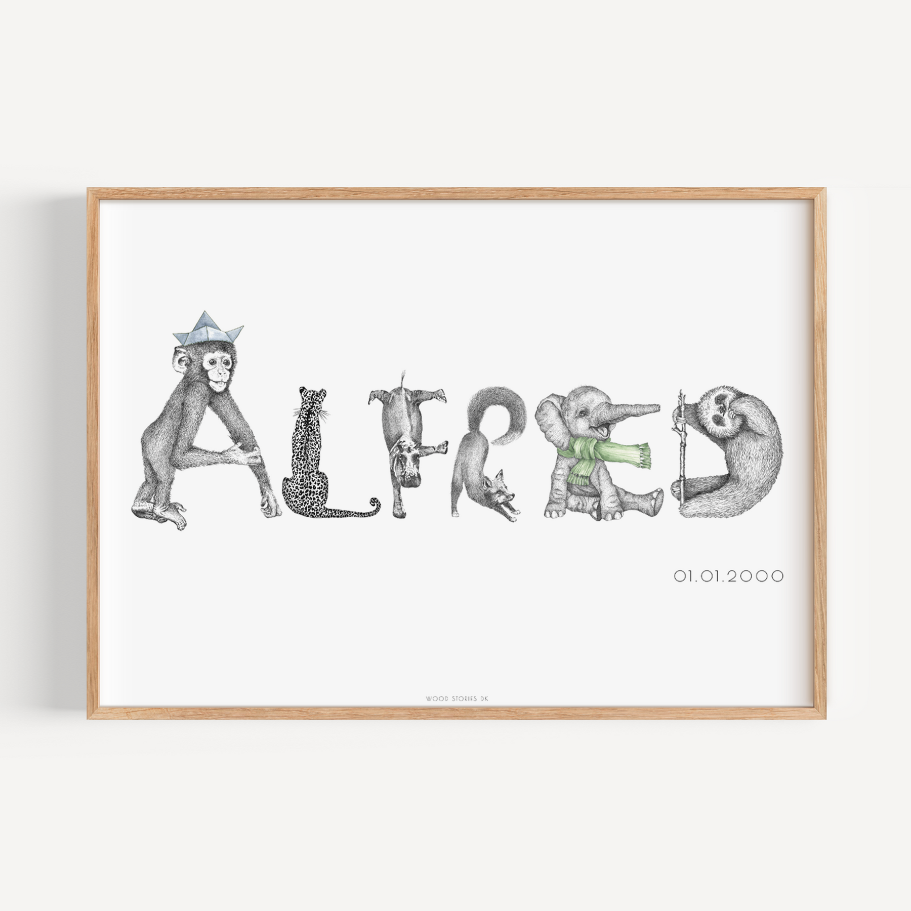 Navneplakaterne fra WOOD STORIES er de eneste af sin art på markedet, idet alle bogstaverne er udformet som dyr, der alle imiterer deres forbogstav. Herved får du en unik og personlig navneplakat, der utvivlsomt tilfører både æstetik, sjov og læring på børneværelset. Barnets fødselsdato kan tilføjes efter ønske.