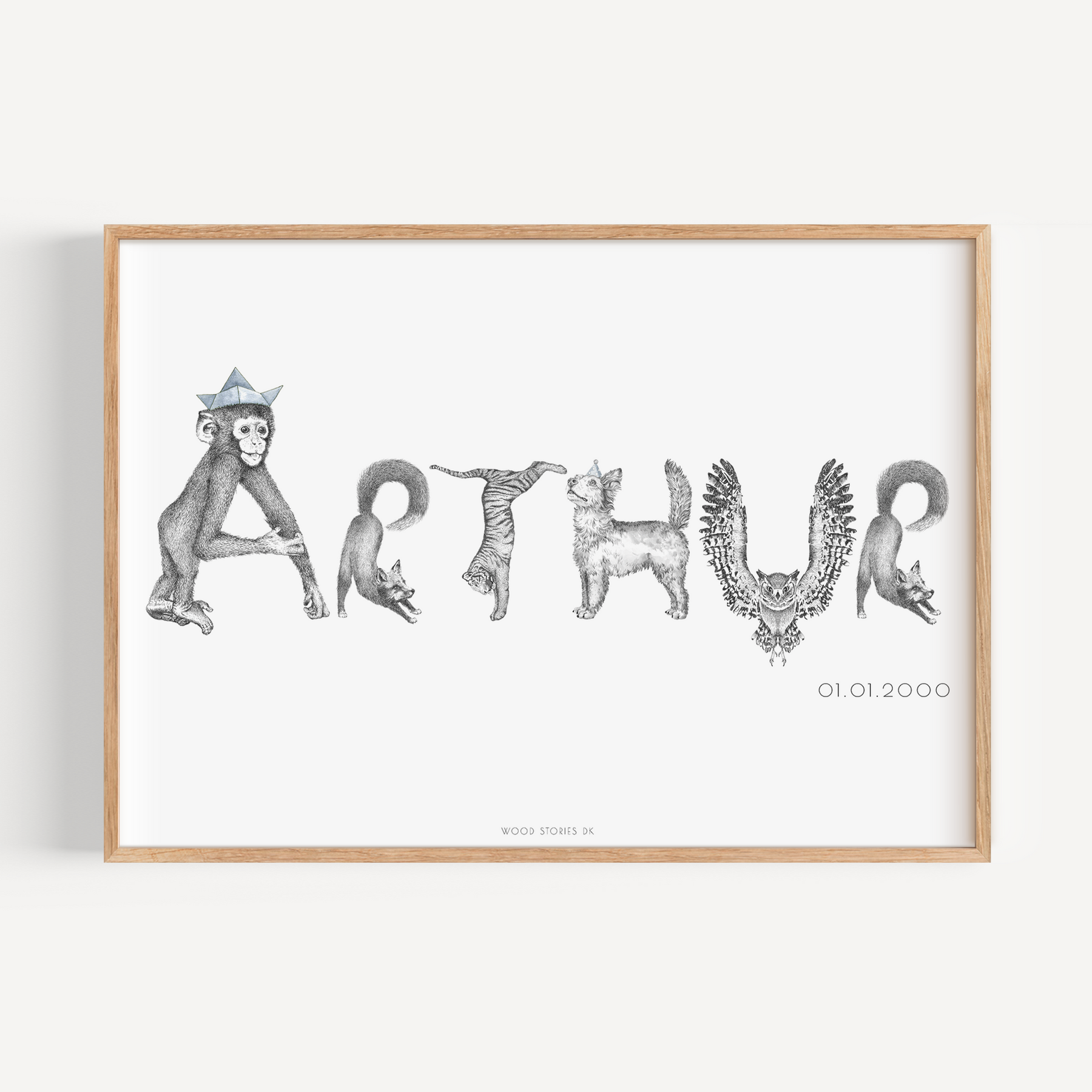 Navneplakaterne fra WOOD STORIES er de eneste af sin art på markedet, idet alle bogstaverne er udformet som dyr, der alle imiterer deres forbogstav. Herved får du en unik og personlig navneplakat, der utvivlsomt tilfører både æstetik, sjov og læring på børneværelset. Barnets fødselsdato kan tilføjes efter ønske.