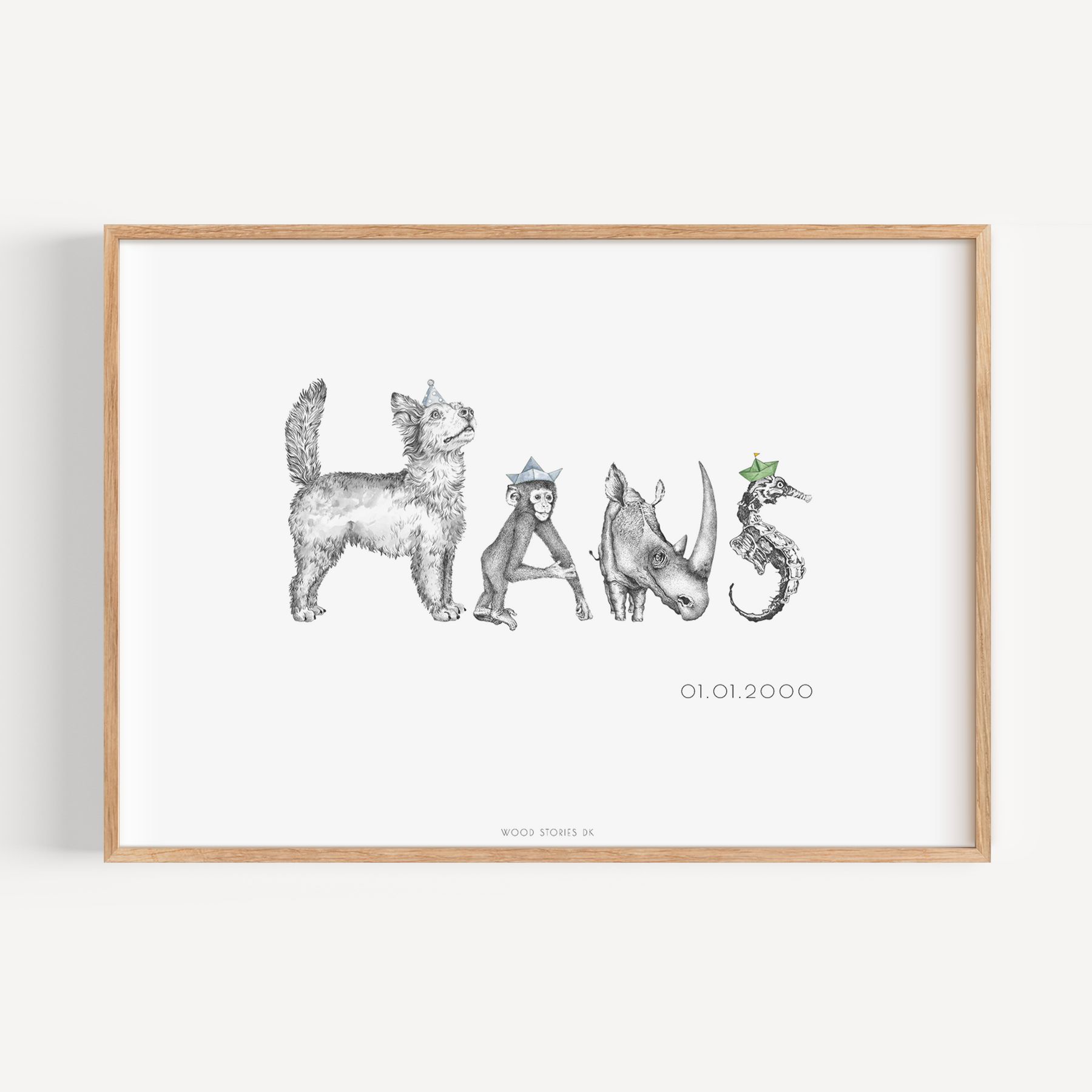 Navneplakaterne fra WOOD STORIES er de eneste af sin art på markedet, idet alle bogstaverne er udformet som dyr, der alle imiterer deres forbogstav. Herved får du en unik og personlig navneplakat, der utvivlsomt tilfører både æstetik, sjov og læring på børneværelset. Barnets fødselsdato kan tilføjes efter ønske.