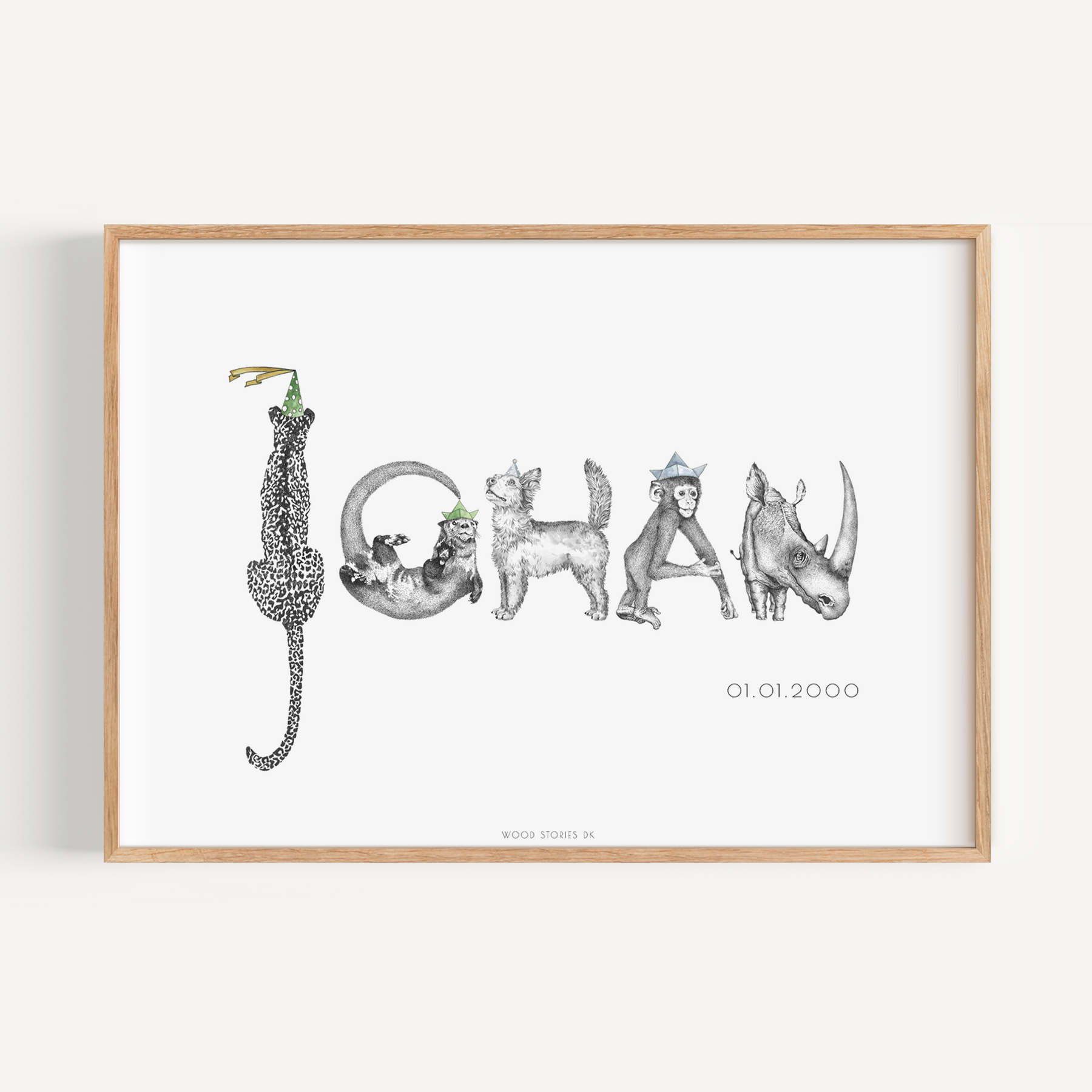 Navneplakaterne fra WOOD STORIES er de eneste af sin art på markedet, idet alle bogstaverne er udformet som dyr, der alle imiterer deres forbogstav. Herved får du en unik og personlig navneplakat, der utvivlsomt tilfører både æstetik, sjov og læring på børneværelset. Barnets fødselsdato kan tilføjes efter ønske.