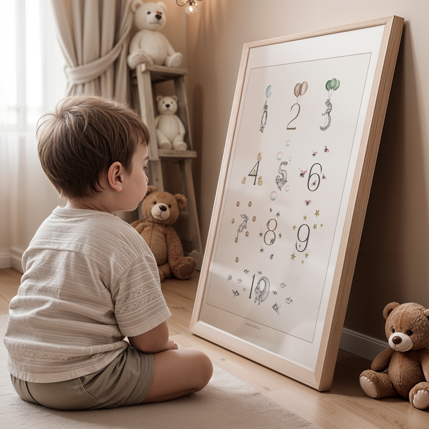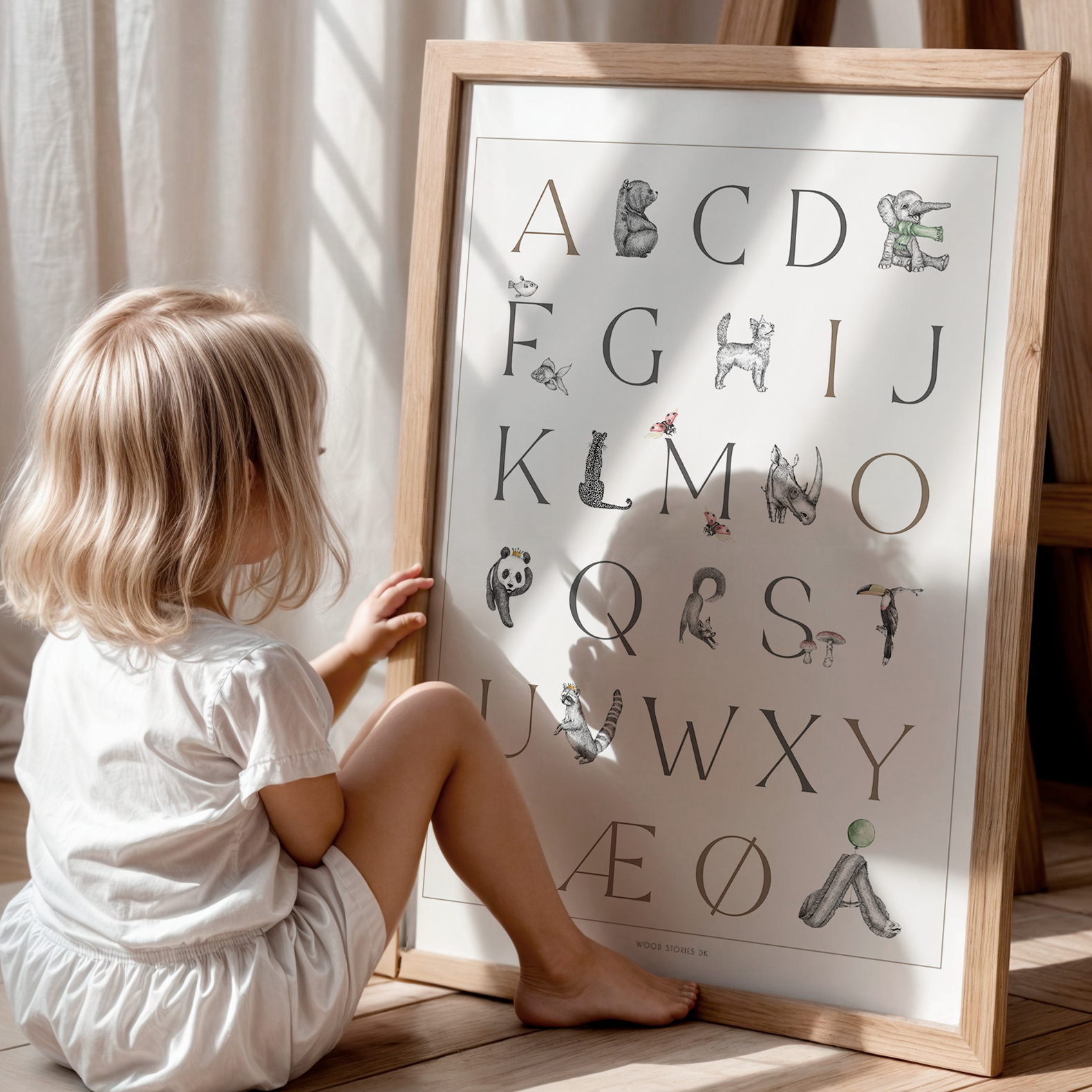 Wood Stories’ navneplakater er designet til at understøtte denne udvikling gennem dyre-bogstaver, hvor hvert bogstav er formet som et dyr, der matcher sit forbogstav. Det gør bogstaverne mere konkrete og genkendelige og hjælper barnet med at forbinde bogstav, billede og lyd. Barnet kan genkende sit eget navn, udpege bogstaver og dyr og gradvist opbygge en intuitiv forståelse for alfabetet – uden krav om at kunne læse.