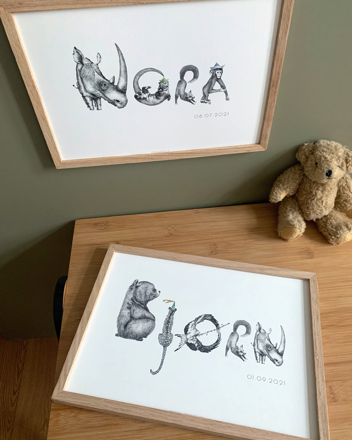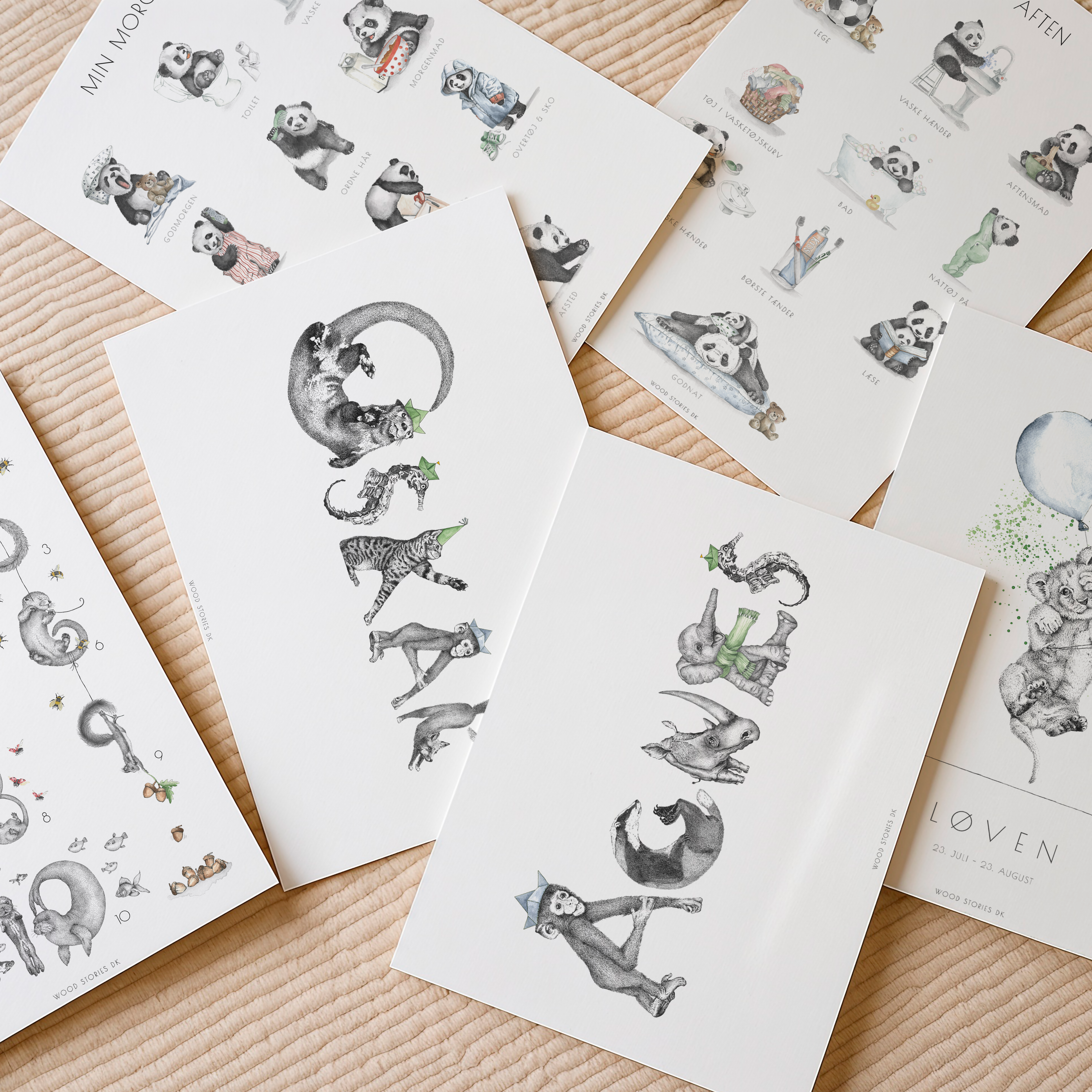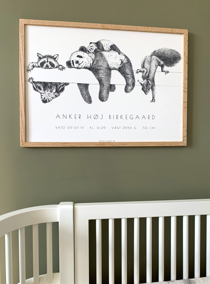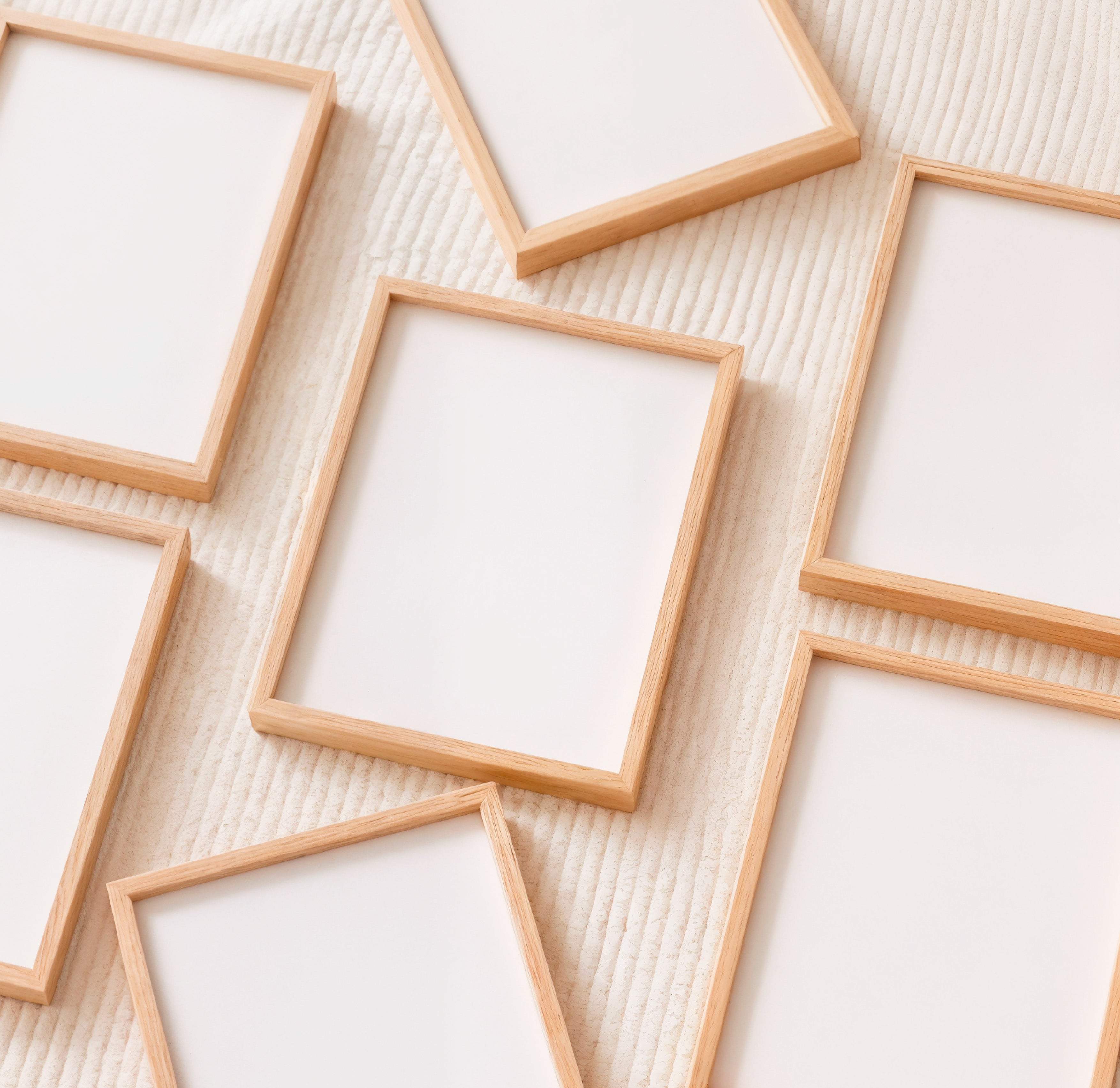 - Vælg 2–3 forskellige størrelser rammer, f.eks. A5, A4, A3, så væggen får variation uden at virke urolig.