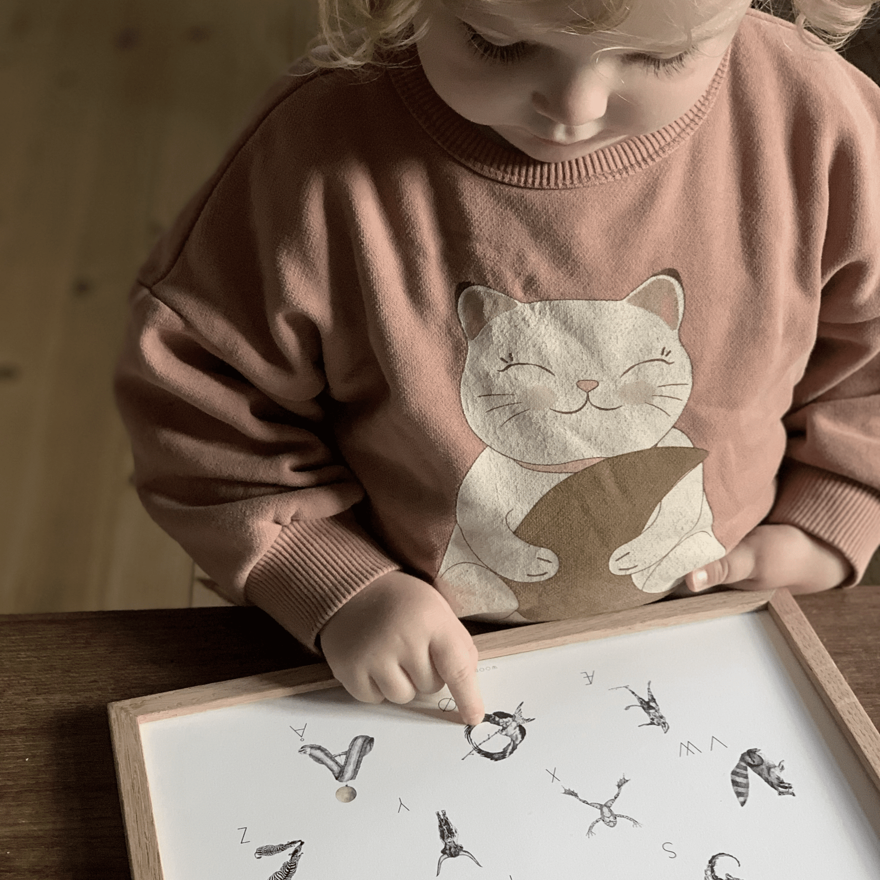 Alfabetplakaten er både dekorativ og lærerig og kan bruges som en naturlig del af barnets hverdag, hvor barnet langsomt lærer bogstaverne at kende gennem leg og nysgerrighed.