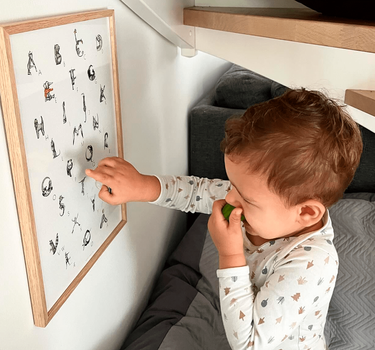 Barn med alfabetplakat med dyr & bogstaver til børneværelse